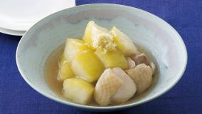 夏に収穫して冬までみずみずしさを保つことから「冬瓜(とうがん)」と呼ばれる野菜ですが、京都では、暑い時季に葛ひき(とろみをつけた煮物や汁物)にしていただくのが定番。とうがんの水分とじっくり含ませた上品な煮汁が、体のすみずみに行き渡る養生おかず。