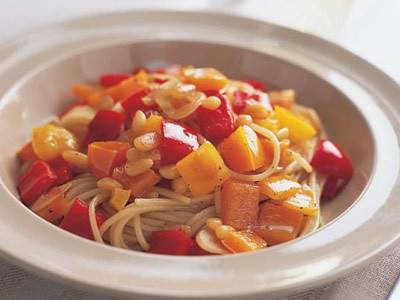 松の実の食感がアクセントに。ジャンボピーマンの甘みもきいています。パスタは好みのものを使ってもOKです。