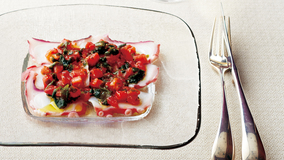 ケッカソースに、わかめとわさびを加えた海の香りたっぷりのソースは、たことの相性抜群!冷えた白ワインにもぴったりですよ。