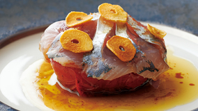 トマトは焼くことで一段と甘みが増します!すっきりしたしょうが汁とにんにくの風味がよく、アンチョビソースで食欲アップ!トマトのうまみと旬のあじが相性バツグンです。