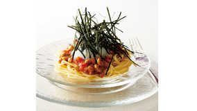 ケッカソースと納豆で和風にアレンジ。納豆の粘りがパスタとよくからみ、トマトとの相性も抜群!温泉卵をくずせばまろやかさが増し、おいしいこと間違いなし!