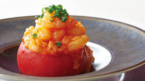 トマトの酸味と甘み、チーズのコクが詰まった、うまみたっぷりのリゾット。口当たりのよいトマトと、プリップリのえびがアクセントになります。