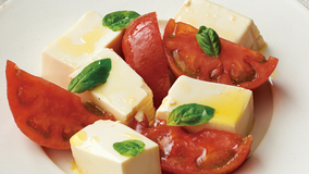 トマトと淡泊な豆腐と合わせた日本風カプレーゼ!口当たりがよく、バジルの葉がいいアクセントになっています。