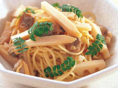 木の芽の香りも春らしい、昆布だしでゆでる和風パスタ。あさり、たけのこの相性が抜群です。